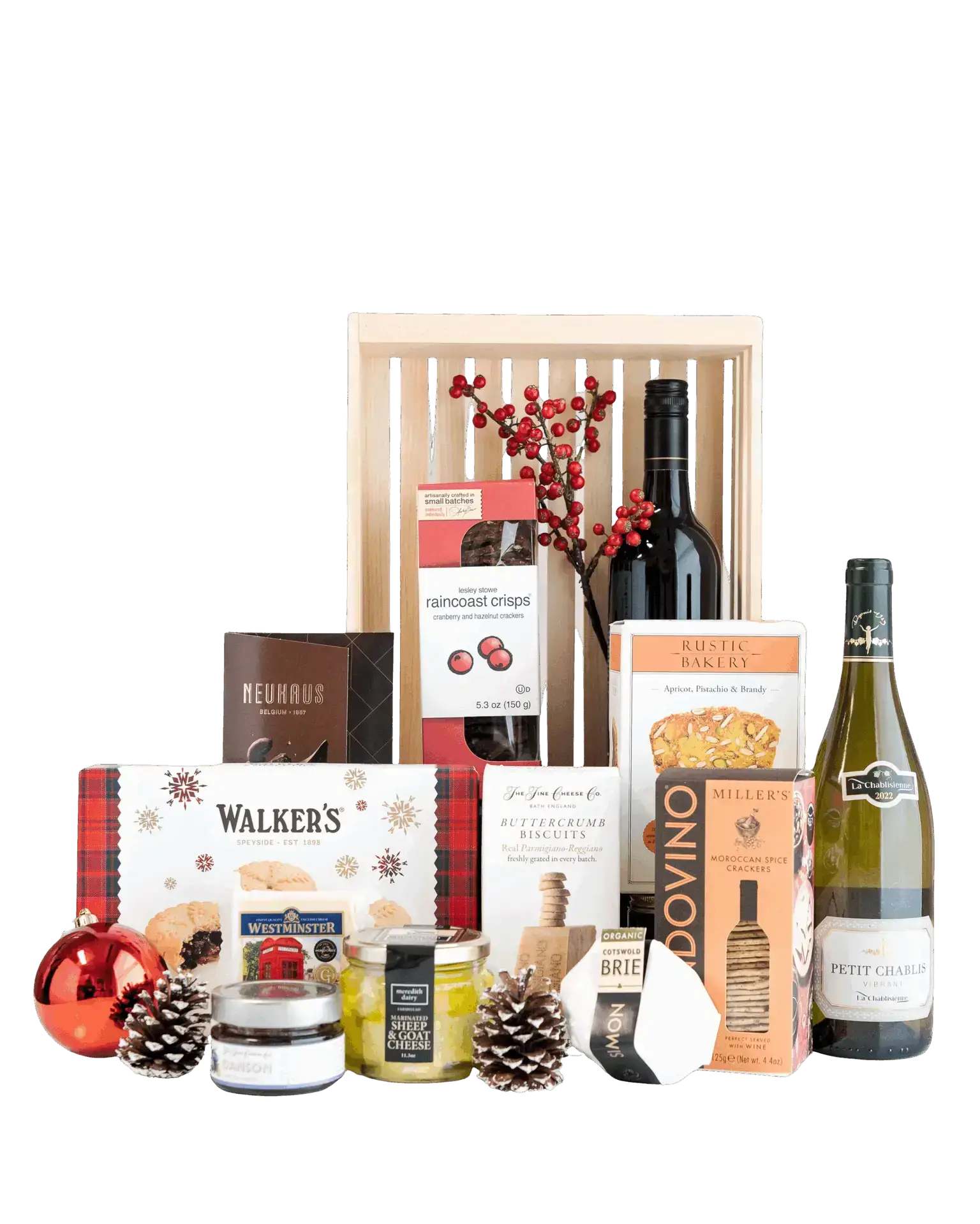 Raise a glass to the season with the an elegant assortment that captures the art of good taste. Thoughtfully curated for wine enthusiasts and holiday hosts alike, this basket brings together fine flavours, festive treats, and timeless indulgence.